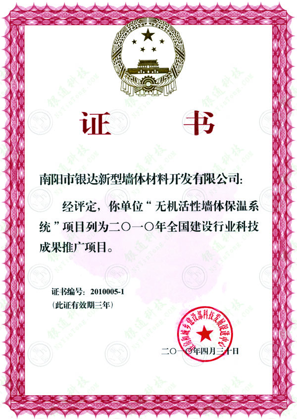 2010全國建設(shè)行業(yè)科技成果推廣項(xiàng)目證書 有效期:三年 。 頒發(fā)時間 2010年4月30日