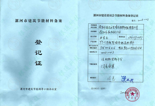 河南省漯河市建筑節能材料備案登記證 漯河市建筑節能領導小組辦公室 企業名稱 南陽市銀達新型墻體材料開發有限公司 產品名稱YT無機活性墻體保溫隔熱系統 系統類別無機活性墻體保溫隔熱系統 認證編號省建設廳推廣證書編號JN2006056 備案登記號2008-08 規格型號YT-A 產品型號50kg/袋 注冊商標銀通 銀達 有效期限2009年8月28日 該公司以上建筑節能產品已通過河南省建設廳認證 并提供了企業相關資料 同意備案 登記備案機關 漯河市建筑節能產品技術管理辦公室 發證日期2011年4月7日