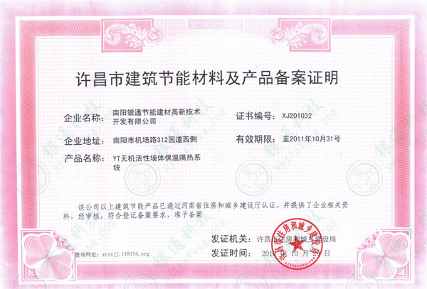 河南省許昌市建筑節能材料及產品備案證書 企業名稱 南陽市銀達新型墻體材料開發有限公司 單位地址 南陽市機場南路312國道西側 產品名稱YT無機活性墻體保溫隔熱系統 系統類別無機活性墻體保溫隔熱系統 證書編號XJ201032 有效期限至2011年10月31日 注冊商標銀通 銀達 該公司以上建筑節能產品已通過河南省建設廳認證 并提供了企業相關資料 同意備案 發證機關 許昌市住房和城鄉建設局 發證日期2010年10月25日