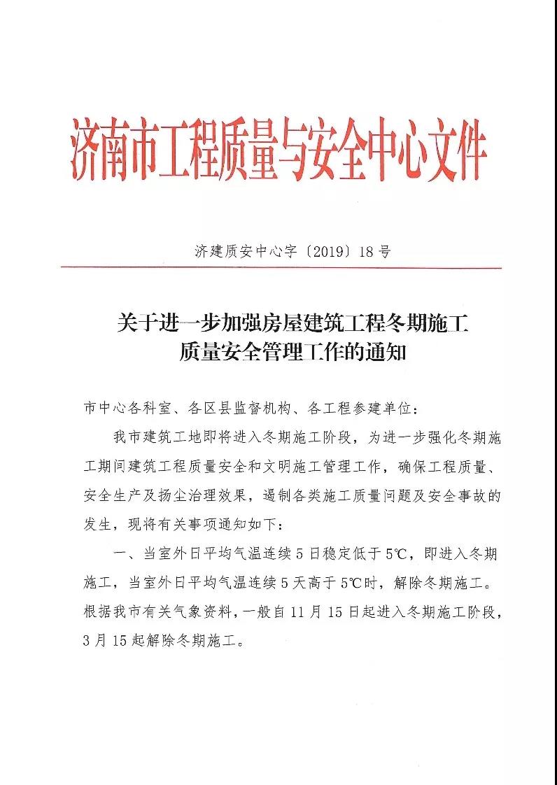 11月13日,濟南市工程質量與安全中心發布了《關于進步一加強房屋建筑工程冬期施工質量安全管理工作的通知》,對冬季外墻保溫施工、防水等提出了要求,具體通知如下: