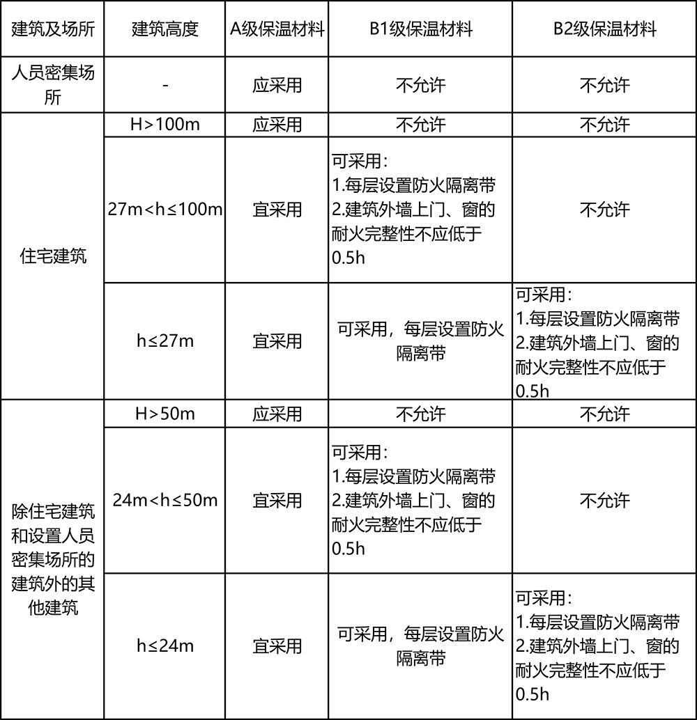 《建筑防火通用規范》與《建筑設計防火規范》都規定了外墻保溫材料宜采用A級不燃燒材料。目前的建筑外墻保溫材料防火等級主要有四級,宜采用A級不燃材料、不宜采用B2級可燃材料、嚴禁采用B3級易燃材料。