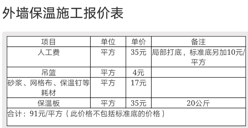 外墻保溫的人工費用價格不定,平均在每平方米35元左右,但根據使用材料,使用地區以及后續工程的差別,價格會上下浮動,外墻保溫人工報價表如下: