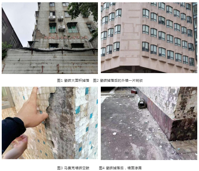 瓷磚脫落一方面有礙觀瞻,就像墻面得了 “牛皮癬”一樣,看上去特別不舒服;另外,瓷磚脫落容易砸傷行人和車(chē)輛,危及樓下行人的生命安全,給社會(huì)公共安全造成較大危害。此外,瓷磚脫落,時(shí)間長(zhǎng)了會(huì)引發(fā)墻體開(kāi)裂,造成室內(nèi)墻體滲漏,墻面裝飾涂料或者墻紙發(fā)生起皮、脫落和霉變現(xiàn)象,給居民生活帶來(lái)諸多不便,而且維修起來(lái)費(fèi)時(shí)費(fèi)力費(fèi)錢(qián),成為不少居民的“心頭病”。圖1—4為海口市老小區(qū)外墻瓷磚空鼓、脫落情況。