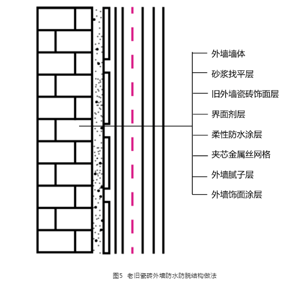 針對(duì)老舊小區(qū)外墻脫落問(wèn)題,筆者公司研發(fā)了一種老舊瓷磚外墻防水防脫施工工藝,該工藝已經(jīng)在海南省舊改外墻項(xiàng)目大量應(yīng)用,均取得較好的施工效果,也申請(qǐng)了國(guó)家知識(shí)產(chǎn)權(quán)局的“實(shí)用新型專利”。該老舊瓷磚外墻防水防脫結(jié)構(gòu)做法見(jiàn)圖5。
